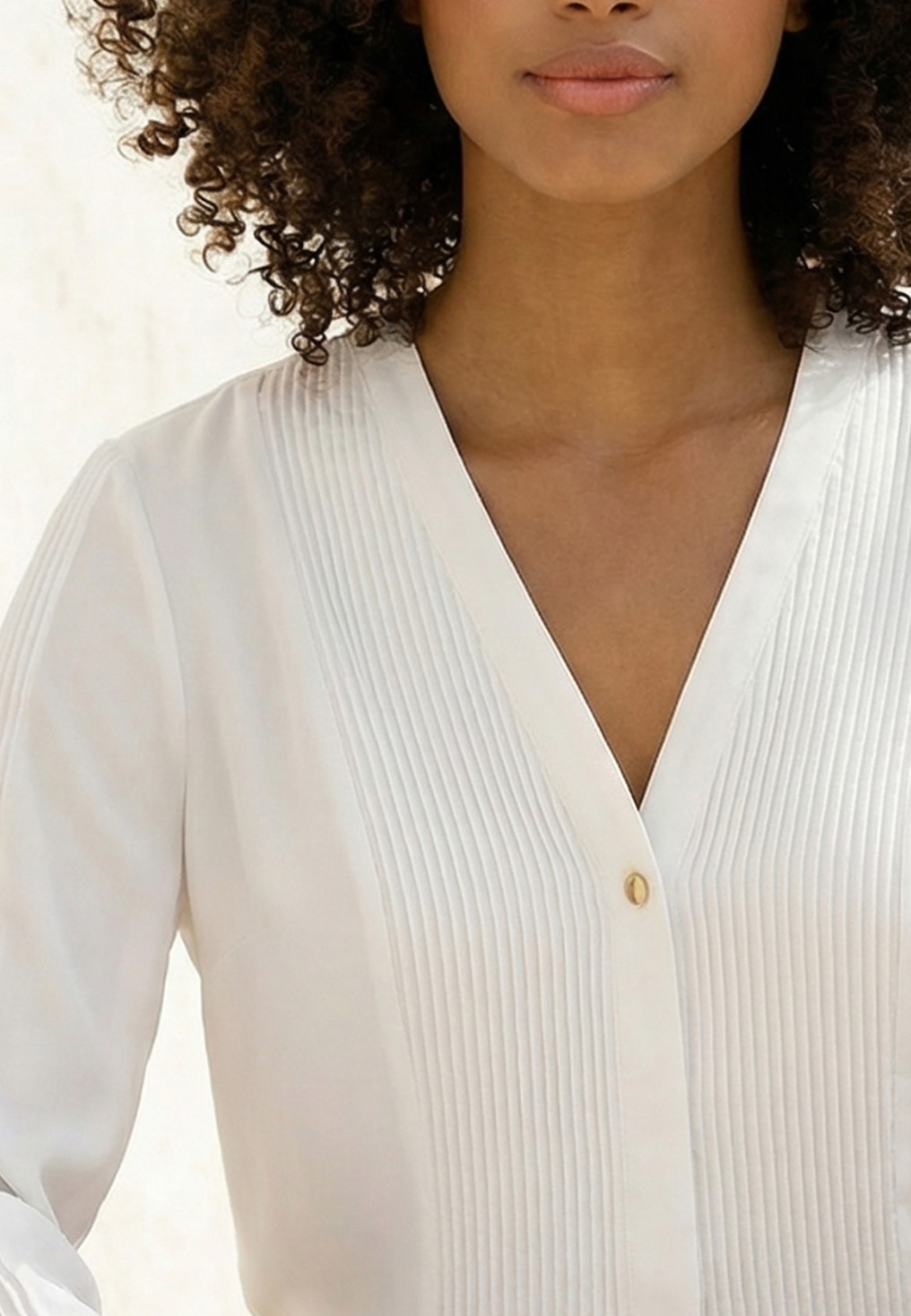 • Encolure V, boutonnage sous patte milieu devant, avec un bouton bijou apparent