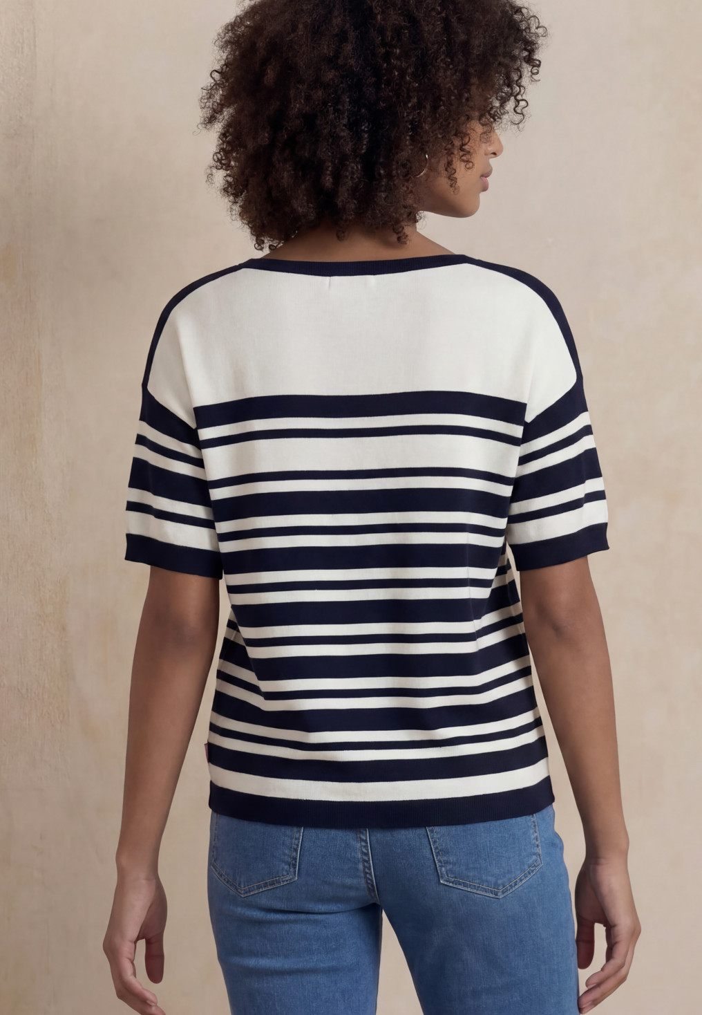 • Maille fine 100% coton travaillée en rayures contrastées