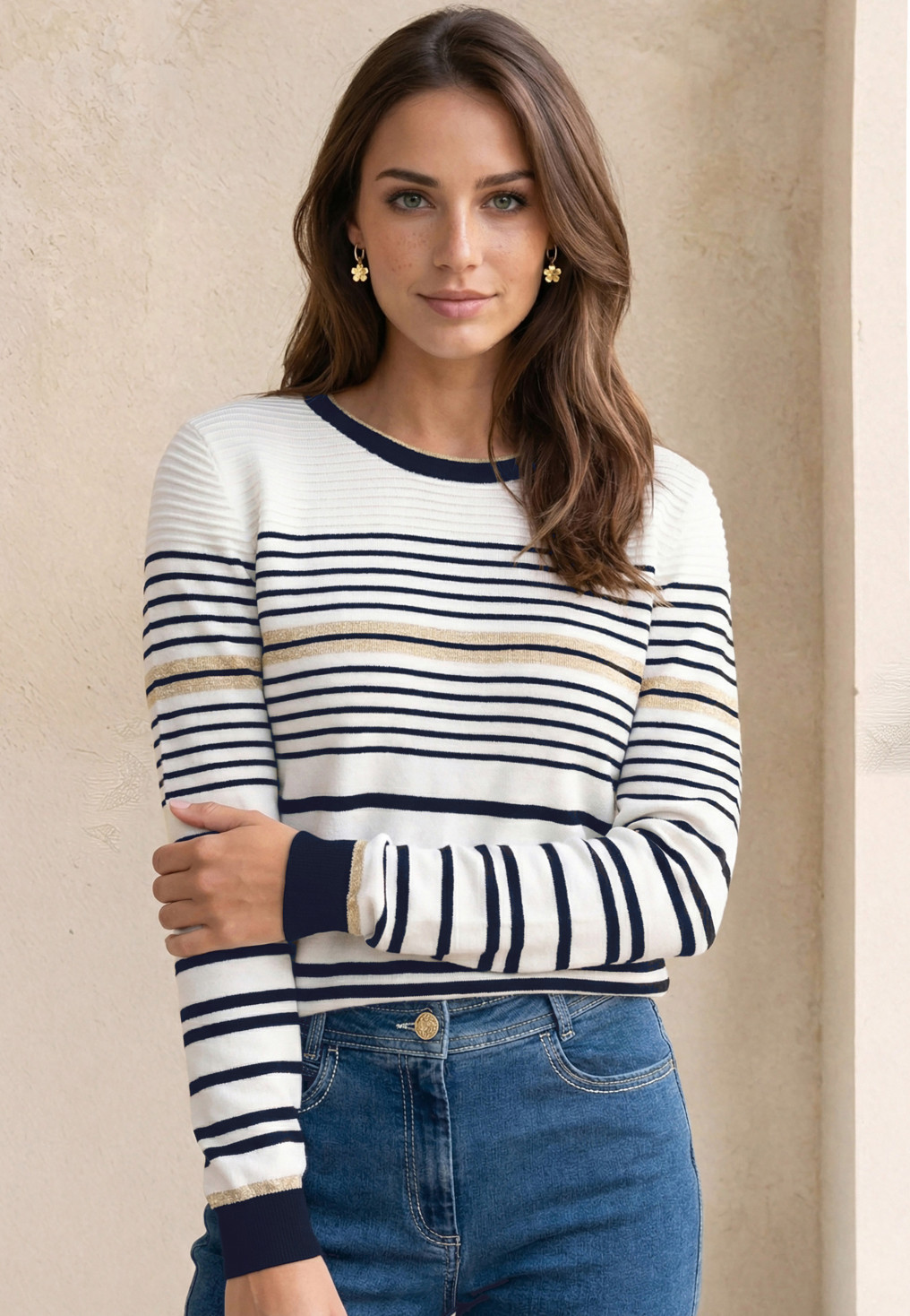 • Joli jeu de contraste des rayures, avec détail de bande en fil lurex