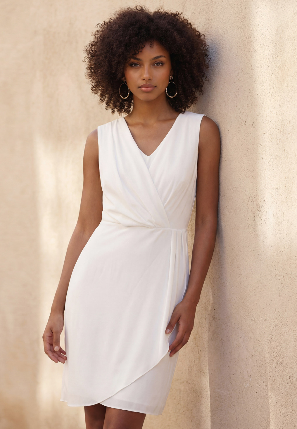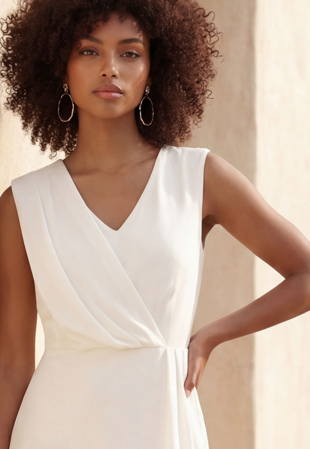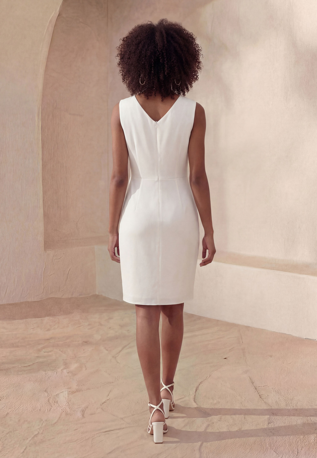 - Robe sans manches ajustée, dans un crêpe au tombé impeccable, encolure V,