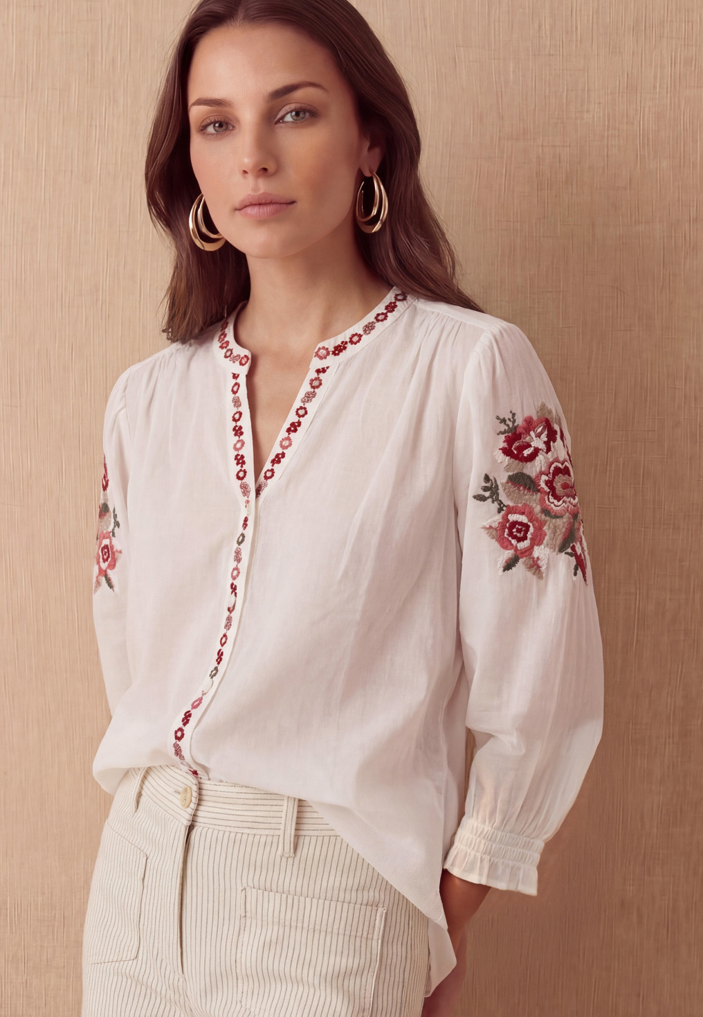 - Beaucoup de fraîcheur pour la blouse Loeva, mise en valeur par une broderie aux tons acidulés
