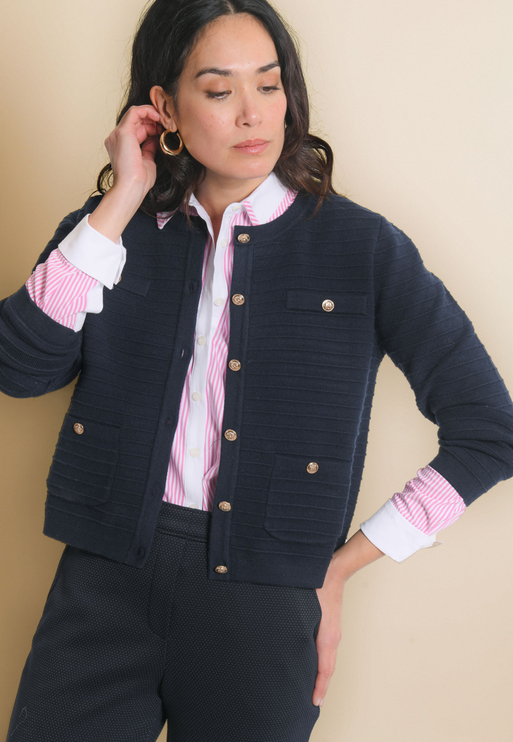 - A la poitrine : deux fausses poches passepoilées avec bouton